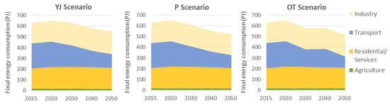 Final energy consumption (PJ) by sector and scenario: (YJ) Yellow Jersey; (P) Pack; and (OT) Off Track.