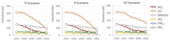 Air pollutant emission estimates for three scenarios (YJ, P, and OT).