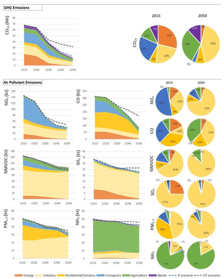 The air pollutant emissions estimates, corresponding to the decarbonizing scenarios, are shown in Table 1 and in Figure 8.