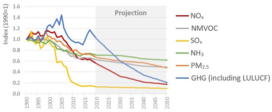 In the European Union (EU), important progress has been made in the last 20 years, in the field of anthropogenic atmospheric emissions and air quality. However, there are still significant negative impacts and risks to human health and the environment, which led to the adoption of specific policies and legal instruments, as the EU Directive 2016/2284 on the reduction of national emissions of certain atmospheric pollutants, being the main legislative instrument to achieve the 2030 objectives of the Clean Air Programme [31]. This directive—referred to also as the NEC Directive—sets national emission reduction commitments for each EU Member State for the period 2020–2029, and more ambitious ones as of 2030, targeting five air pollutants responsible for significant negative impacts on human health and the environment: SO2, NOx, NMVOC, NH3, and fine particulate matter PM2.5. The aim established in the Clean Air Programme is to reduce the health impacts of air pollution by half by 2030 compared to 2005.