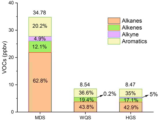 Figure 2 also shows the group compositions (alkanes, alkenes, alkyne and aromatics) of VOCs observed at the three sites. Alkanes were the most abundant with the proportions of 62.8%, 43.8% and 42.9%, followed by aromatics with shares of 20.2%, 36.6% and 35%, alkenes with shares of 12.1%, 19.4% and 17.1%, and alkynes with shares of 4.9%, 0.2% and 5%, respectively, at the MDS, WQS and HGS sites. The higher proportion of alkanes at the MDS site might reflect more contributions from liquefied petroleum gas (LPG)-related sources and vehicle emissions in the urban area [41], while the higher proportion of aromatics in the WQS and HGS sites might be related to stronger emissions in the surrounding areas from industrial point sources, most of which had been moved from urban areas to industrial parks in rural or suburban areas.