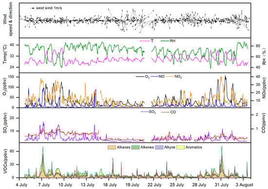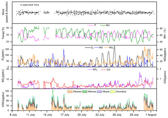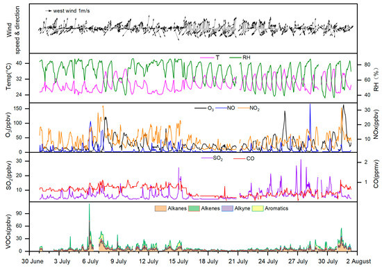 At the WQS site, higher concentrations of O3 appeared from 7 July to 9 July and also from 29 July to 1 August when wind speed was low and the concentrations of VOCs and NOx were both at higher levels.