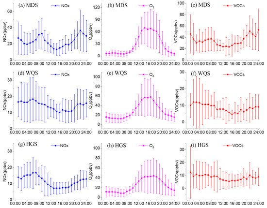 Diurnal variations of (a) nitrogen oxides (NOX) at MDS, (b) O3 at MDS, (c) VOCs at MDS, (d) NOx at WQS, (e) O3 at WQS, (f) VOCs at WQS, (g) NOx at HGS, (h) O3 at HGS, and (i) VOCs at HGS. Points represent the means. Error bars represent the standard deviations.