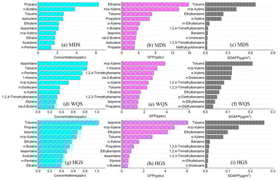 The top 10 VOC species by (a) concentrations at MDS, (b) ozone formation potentials (OFP) at MDS, (c) secondary organic aerosol formation potential (SOAFP) at MDS, (d) concentrations at WQS, (e) OFP at WQS, (f) SOAFP at WQS, (g) concentrations at HGS, (h) OFP at HGS, and (i) SOAFP at HGS.
