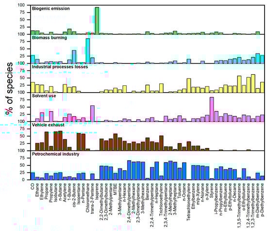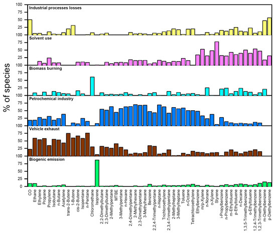 Figure 8 shows the source profiles resolved by PMF at the MDS site. Factor 1 shows a higher contribution by C8- and C9-aromatics and substantial contributions by trichloroethylene and tetrachloroethylene, therefore it may be related to industrial process losses [31]. Factor 2 is characteristic of higher proportions of aromatics such as toluene, styrene and ethylbenzene that are generally used as solvents [52,53], and it can be termed solvent use. Chloromethane, which is a marker of biomass burning [53,54,55], contributes the most in the Factor 3, and some alkenes and aromatic hydrocarbons also occurs in the Factor 3 [56]. Therefore, Factor 3 is considered as biomass burning. Ethylene, acetylene, ethane and 1-butene, as well as 2-methylhexane, n-heptane and methyl cyclohexane, which might be related to oil cracking process [57,58], are present in the Factor 4. Therefore, Factor 4 is regarded as petrochemical industry emissions. Factor 5 shows highest contributions by propane, isobutane and n-butane, which are markers of LPG-related emissions [59] and also among most abundant species from on-road vehicle fleets with a considerable portion of LPG-fueled buses and taxies [41], meanwhile MTBE, a tracer of gasoline-related emissions [43], and vehicle exhaust related C5 and C6 alkanes [43,60], are also present in the Factor 5. So Factor 5 represents vehicular emissions. Isoprene from plant emissions [55] contributes the most in the Factor 6, which is thus biogenic emission. Figure 9 and Figure 10 show source profiles resolved by PMF at the WQS and the HGS sites, respectively. Similarly emission sources are identified based on the factor profiles.