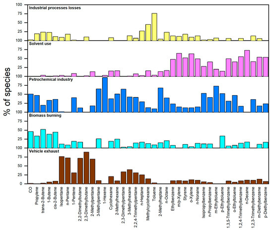 - Yuan, B.; Shao, M.; Lu, S.; Wang, B. Source Profiles of Volatile Organic Compounds Associated with Solvent Use in Beijing, China. Atmos. Environ. 2010, 44, 1919–1926. [Google Scholar] [CrossRef]