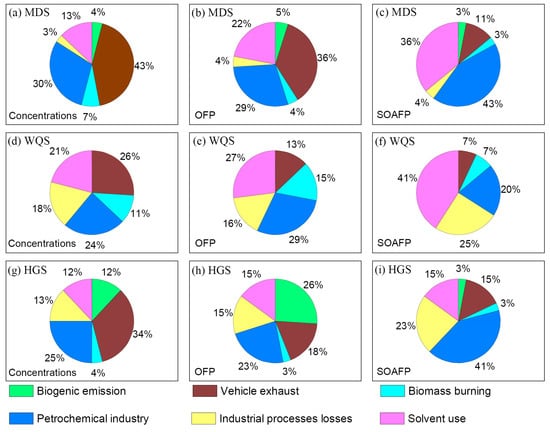 The source contributions to VOCs (a) concentrations at MDS, (b) OFP at MDS, (c) SOAFP at MDS, (d) concentrations at WQS, (e) OFP at WQS, (f) SOAFP at WQS, (g) concentrations at HGS, (h) OFP at HGS, and (i) SOAFP at HGS.