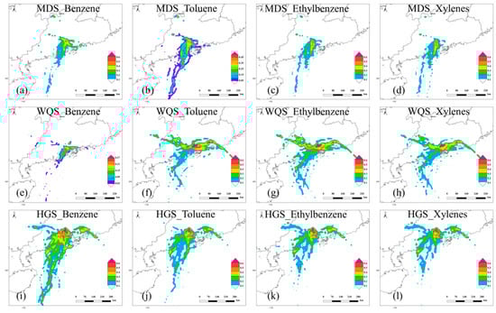 The PSCF analysis for potential source areas of (a) benzene at MDS, (b) toluene at MDS, (c) ethylbenzene at MDS, (d) xylenes at MDS, (e) benzene at WQS, (f) toluene at WQS, (g) ethylbenzene at WQS, (h) xylenes at WQS, (i) benzene at HGS, (j) toluene at HGS, (k) ethylbenzene at HGS, and (l) xylenes at HGS.