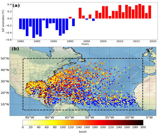 (a) Centennial Time Scale (COBE) sea surface temperature (SST) anomalies time-series; (b) location of the genesis (blue points) and peak of maximum intensity (the color bar represents the maximum surface wind) of (tropical cyclones TCs) formed in the North Atlantic (NATL) basin. The genesis point is defined as the first reported location in the Atlantic hurricane database (HURDAT2) database. The black dashed line represents the interest area for the SST analysis. Period: June–November from 1980 to 2019.