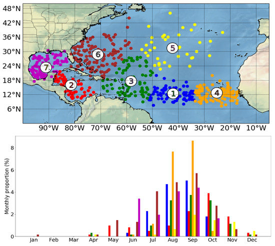 From the cluster technique, seven regions, in which the genesis of TCs in the NATL frequently occurs, were identified. These are the tropical Central North Atlantic (G1, purple) that represents 14.9% of the total genesis counts in the study period, the Caribbean Sea (G2, red, 11.7%), the Lesser Antilles arc (G3, green, 13.1%), the coast of West Africa (G4, orange, 18.2%), the Central North Atlantic (G5, yellow, 6.2%), the northeast of the Bahamian archipelago (G6, brown, 21.3%), and the Gulf of Mexico (G7, blue, 14.6%), as shown in Figure 2 (top). The monthly seasonality of TCs formed on each cluster is represented in Figure 2 (bottom). Genesis at the beginning of the hurricane season generally occurs at high latitudes due to favorable thermodynamic conditions and in the Gulf of Mexico, while at the end of the season they are more frequent in the western Caribbean Sea and the central North Atlantic. The regions G1 and G4 exhibit the highest frequency of genesis in August and September, coinciding with the peak of the cyclonic season. These G1,4 TCs are frequently originated from African easterly waves.