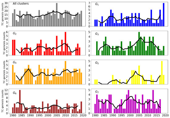 Annual TC genesis counts for the whole NATL basin and for each cluster. The bold line shows the time series filtered with a centered 5-yr moving window. GN (N = 1, 2, 3, 4, 5, 6, 7) represents each genesis cluster.