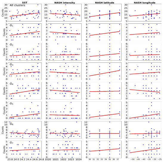 The relationship between the mean annual SST during the TC season in the NATL basin and the number of genesis was first analyzed using Pearson’s correlation. A strong statistically significant correlation was observed at 95% significance level between SST and TC genesis throughout the basin, as well as in the G1 and G4 regions, as shown in Table 1. In G2, G3, and G5, the correlation coefficient ranged between 0.13 and 0.30, however, it was not statistically significant. The inverse correlation (p > 0.05) observed in the G6 and G7 clusters is curious, and constitutes a strong evidence of the complexity of the physical processes for TC genesis. In these two regions, the other preconditions described by Gray [66] seem to be more important. The NASH latitude center is significantly correlated with TC genesis frequency (r = 0.36) in the whole basin, while G3 (r = 0.36) is significantly correlated, too. No significant correlations were found between TC genesis and NASH intensity and NASH longitude center (Table 1).