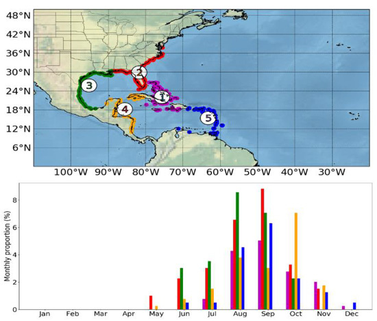 Map representation of TC landfalling regions (top) and monthly proportion of landfalling for each cluster (bottom). The monthly proportion was computed as the proportion of landfalling count in a month for a cluster and the sum of total landfalling (L1 +…+ L5) (1980–2019). Note that landfalling on the east coast of the United States from 40°N latitude and those that occurred on the islands located in the central North Atlantic were not considered.