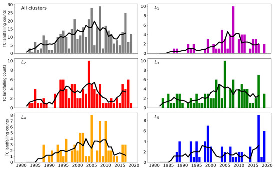 Annual landfalling counts for the whole NATL basin and each cluster. The bold line shows the time series filtered with a centered 5-yr moving window. LN (N = 1, 2, 3, 4, 5) represents each landfalling cluster.
