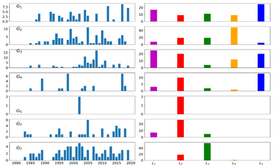 The landfalling of the TCs formed in G1 are distributed among all the LN regions (N = 1, 2, 3, 4, 5), although the highest frequency is observed in L5. Similarly, G3 and G4 also exhibit high frequencies of landfalling in L5, as shown in Figure 7. We assume that these distributions are mainly due to the wide range of trajectories for these TCs. Additionally, G3 has the highest frequency of landfalling in the central−eastern region of Cuba, the archipelago of the Bahamas, and the west of La Española (L1), and another secondary maximum in L2. TCs formed in the western Caribbean Sea frequently make landfall on the coasts of Central America, the Yucatan Peninsula, and the western region of Cuba (L4). In L2, TCs that form in G4 and G6 frequently make landfall, while those originating in the Gulf of Mexico (G7) generally struck the coastline in L3.