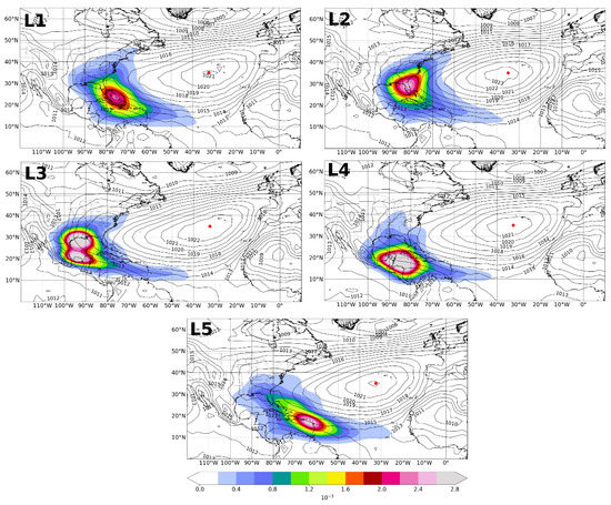 The landfalling events mostly depend on the TC trajectory, which is influenced by the large-scale steering flow. Changes in the NASH position and intensity induce large-scale flow changes that affect the TCs track and, consequently, the probability of landfalling. Figure 8 shows the TCs track density of TCs that made landfall in each region and the mean position of the NASH (composite using the specific month and specific year of landfalling event). As can be seen, there is no significant variation in the position of NASH center, however, there are appreciable differences in the NASH structure, which modulate the preferential trajectory followed by the TCs. For L1 and L2, the anticylonic ridge is less pronounced, while for L3 and L4, it penetrates to the Florida Peninsula. For the L5 region, the structure of the NASH shows a pattern similar to that observed for L1 and L2, although more contracted, suggesting that TCs that make landfall in L5 have a high probability to make landfall again in L1 or L2. The NASH structure directly influences the distribution of the probability density tracks of TC that make landfall. The effect is different depending on the genesis location. TCs that develop in the eastern part of the main development region (G4) tend to have a low probability of landfalling than those that develop in the western part (G1 and G3), due to the longer time over the tropical ocean. These results fully support the findings of Colbert and Soden [36], who pointed out that the evolution of NASH throughout a hurricane season affects the TCs trajectory in the NATL basin. When the NASH is strong and centered to the west, TCs are directed south toward the Gulf of Mexico, increasing the landfalling probability.