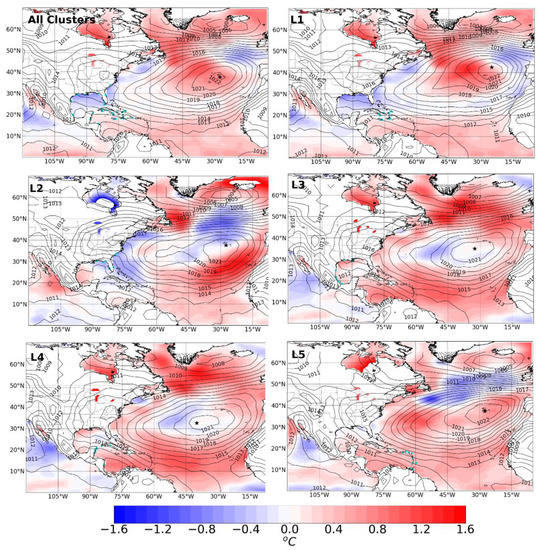 Composite of NASH position and structure (contour) for months with landfalling events in the year of maximum landfalling frequency for the whole basin and each region. The shaded plots represent the mean SST anomalies for the same months and years of NASH position and structure composite. The black star point represents the NASH center, and cyan points represent landfalling events. “All clusters” represents the whole basin and LN (N = 1, 2, 3, 4, 5) represents each landfalling cluster.