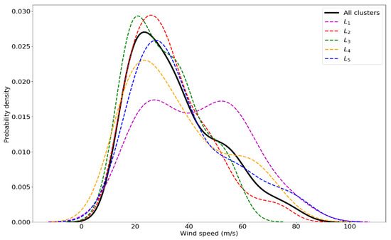 Probability density of intensities at TC landfalling for the wide NATL (the sum of landfalling counts in all regions) and each cluster.