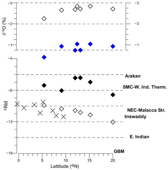 - Stoll, H.M.; Vance, D.; Arevalos, A. Records of the Nd isotope composition of seawater from the Bay of Bengal: Implications for the impact of Northern Hemisphere cooling on ITCZ movement. Earth Planet. Sci. Lett. 2007, 255, 213–228. [Google Scholar] [CrossRef]