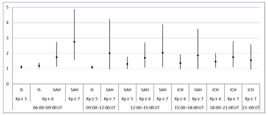 The analysis of the effects of GS occurring at different times of the day showed that stronger effects of GS were observed during the period of 6:00–9:00 UT; only GS occurring at this time were associated with a higher rate of IS (Figure 1). The GS occurring at 6:00-18:00 UT had a stronger effect on SAH; besides, GS occurring at 15:00–21:00 UT had a stronger impact on ICH (Figure 1).