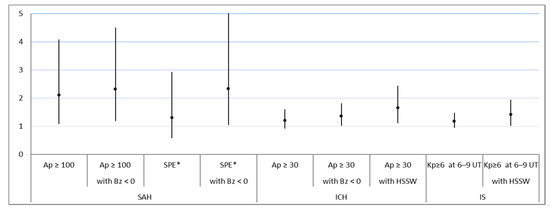 A trend was observed for an increased risk of stroke with increasing severity in GSs [22]. We found a stronger possible effect of GS occurring in conjunction with a negative Bz or with HSSW. According to the data since 1995, the effect of strong/severe SPE with Bz < 0 increased the RR for SAH. Minor+ GS with Bz < 0 or HSSW increased the RR for ICH.