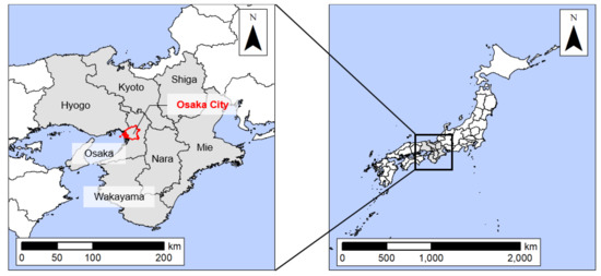 In addition, two grids were set up: one for the area to be analyzed and the other for the larger area covered with a rough resolution. For Osaka City, the target area, a 1 km × 1 km grid was set. For the larger area, a 5 km × 5 km grid was set for Kinki region (Mie, Shiga, Kyoto, Osaka, Hyogo, Nara, and Wakayama Prefectures), assuming that O3 and its precursors are transported from outside the target area [32].