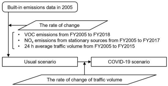 In this study, we compared and analyzed two scenarios: a scenario reflecting the normal situation in recent years (usual scenario) and a scenario for reduced traffic due to the declaration of the state of emergency for COVID-19 (COVID-19 scenario), as shown in Figure 2 with the dataset and analysis procedure. The NOx emission sources include power plants and refuse incineration plants, which support the lives of citizens [33,34]; they were assumed to have been operating normally during the declaration of the state of emergency. To simulate the conditions based on the reduction of traffic volume due to COVID-19, at first, we extracted the rate of year-on-year change in traffic volume of major sections of expressways (West Nippon Expressway, Honshu-Shikoku Bridge Expressway, and Hanshin Expressway) in the Hanshin area only on weekdays and averaged over the period of declaration of the state of emergency [3]. Next, the rate of year-on-year change in traffic volume of general roads was calculated by extracting the rate of year-on-year change in traffic volume of National Route 1 on weekdays and averaged over the period of the declaration of the state of emergency [3]. The rate of year-on-year change of expressways and general roads was set uniformly in the Kinki region, including Osaka City. Finally, we multiplied the 24 h average traffic volume on expressways and general roads in FY2015 by the rate of year-on-year change in traffic volume for each road type and calculated the rate of change in traffic volume during the period of the declaration of the state of emergency, with weighting of the traffic volume for each road type by prefecture: