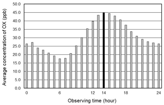 Hourly average concentration of OX observed at 14 stations in Osaka City from April to September in 2018 [40]. The concentration at 14:00 was the highest, at 44.9 ppb.
