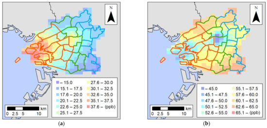 where Calk is the estimated value, Obsk is the observed value, and N is the number of data. In this study, as substances for estimating health risks, the average NO2 concentrations estimated from April to September and the average O3 concentrations estimated at 14:00 of the specific weather patterns from April to September were compared with the average concentrations observed in FY2018 in the grid where each concentration was estimated. In Osaka City, NO2 and O3 concentrations were observed at 25 and 14 stations, respectively, in FY2018 [37].
