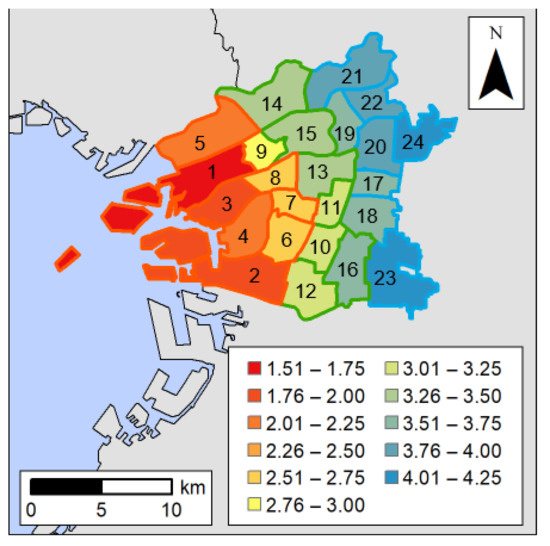 Table 1 lists the VOC/NOx concentration ratios (in ascending order) obtained from the average VOC and NOx concentrations estimated from April to September for each ward, and Figure 5 shows the VOC/NOx concentration ratio with the location of each ward. Since the VOC/NOx concentration ratios of all the wards were below 6 to 12, as indicated by Kannari [28], overall, Osaka City had a high intensity of VOC-sensitivity. Therefore, we divided the ward into three groups of eight wards, starting from the ward with the smallest concentration ratio and the highest intensity of VOC-sensitivity, and classified them based on high (Group High), middle (Group Middle), and low (Group Low) intensities of VOC-sensitivity (Figure 5). The average VOC concentrations in each group were 71.4, 85.7, and 90.7 ppb, and the average NOx concentrations were 33.8, 26.8, and 23.7 ppb. Group High mainly included coastal areas, and Group Middle to Group Low comprised inland wards. The top ten wards with the highest VOC concentrations were distributed among the three groups, whereas seven of them with NOx concentrations were included in Group High. This finding indicates that NOx concentration contributed significantly to the group to which a ward belonged.