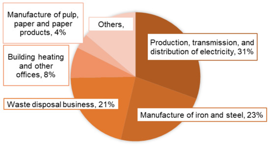 Breakdown of NO2 emissions from the industrial sector in Osaka City in FY2018 [12]. A total of 2699 t/year of NO2 was emitted from all sectors in Osaka City in FY2018.