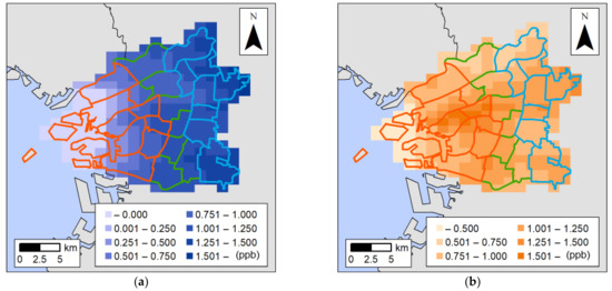 In the COVID-19 scenario, NO2 concentrations decreased by an average of 0.962 ppb in 88.9% of the grids in Osaka City compared with the usual scenario due to the reduction in traffic caused by COVID-19 (Figure 7a). Regarding the characteristics of each group, seven out of eight wards belonging to Group Low were among the top ten wards with the largest decrease in NO2 concentration (Table 2). On the other hand, Group High did not include any of these wards (Table 2) given the absence of significant stationary emission sources in Group Low (Table 1). Thus, the proportion of emissions from mobile sources was large, and the decrease in traffic volume in the COVID-19 scenario may have caused a large decrease in NO2 concentration in the wards belonging to Group Low. By contrast, Group High included significant stationary emissions, such as the power plant and refuse incineration plant. However, given that these operations continued in the COVID-19 scenario, the overall decrease in NO2 concentration was considered to be relatively small, although only the emissions from mobile sources decreased with the decrease in traffic. The NO2 concentration in Konohana Ward was 33.1 ppb in the usual scenario and 33.4 ppb in the COVID-19 scenario, resulting in an increase of 0.261 ppb. However, considering the possibility of overestimation using the NME in Section 4.1, the NO2 concentration was at its lowest at 22.1 ppb in the COVID-19 scenario. With the increase in 0.261 ppb being within the margin of error, it is unclear as to whether only NO2 the concentration in Konohana Ward followed an increasing trend.