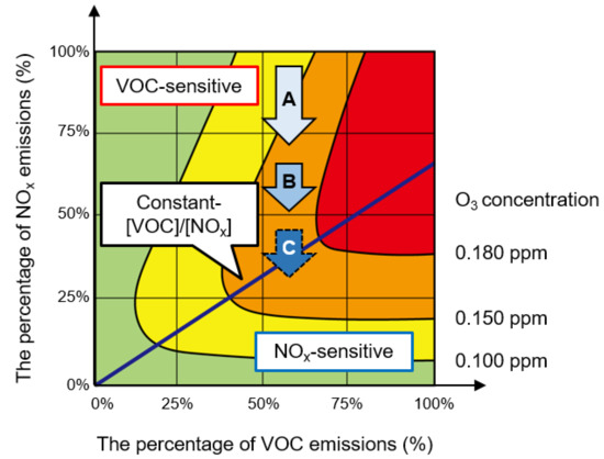Dependence of O3 concentration on VOC and NOx emissions and isoconcentration area of O3. The vertical and horizontal axes represent the percentage of NOx and VOC emissions, respectively. The center line represents the border of NOx- and VOC-sensitive conditions, above which is the VOC-sensitive condition, and below which is the NOx-sensitive one. The same color area represents the same O3 concentration. (Modified from the MOE [47]).