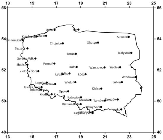 Heat waves in Poland are described using maximum daily temperature records from 40 meteorological stations in Poland covering the period 1951–2019. The locations of these stations are presented in Figure 1. Data were obtained from the archive datasets of the Institute of Meteorology and Water Management—National Research Institute (IMWM-NRI) in Poland. The data published by IMWM-NRI are quality controlled. Breaks in measurements were supplemented using data from a few neighboring stations. At any of the selected stations, gaps did not exceed 1%. At one station (Rzeszów), the data starts from January 1952, and at another (Lesko), from June 1954. They both are located in the southeast of the country.