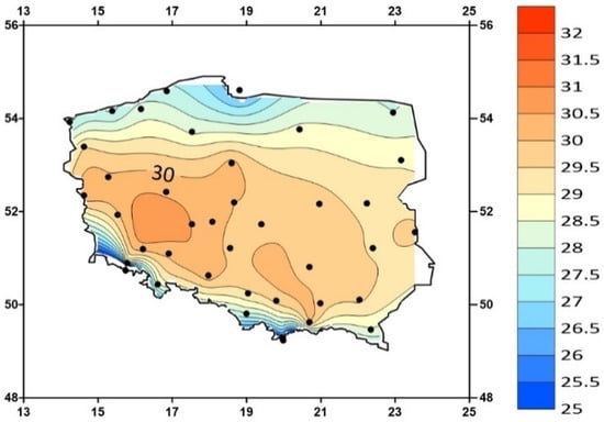 The literature provides three groups of definitions based on relative and absolute thresholds. The first group uses absolute thresholds and a heat wave is defined as a sequence of at least three days with maximum daily temperature equal to or higher than 30 °C [,,,]. The second group of definitions is based on the thresholds defined using the statistical distribution of Tmax. Heat wave is a period of at least three or five consecutive days during which Tmax exceeds the long-term average by one or more standard deviations [] or established amount of Celsius degrees (5 °C, []). In the last group of definitions, the threshold is based on the probability of occurrence of a particular Tmax. Often the 95th annual or summer percentile of Tmax is used and a heat wave is usually defined as a period of three or five consecutive days with Tmax exceeding this threshold [,,]. Because the topic of this paper is heat waves that simultaneously cover a significant part of the country’s surface, this third definition was adopted. A hot day is defined as a day with Tmax exceeding the 95th summer percentile of Tmax in the reference period 1961–1990 and a heat wave is defined as a period of at least three consecutive hot days.