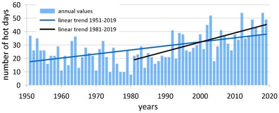 Annual frequencies of hot days in Poland in the period 1951–2019.