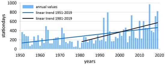 In order to take into account the spatial extent of heat in Poland, the number of hot station-days was analyzed (Figure 6). The annual frequencies of heat station-days in Poland were increasing. The linear trend throughout the analyzed period was 48.8 station-days/decade. After 1980, the trend significantly increased and amounted to 110.7 station-days/decade.