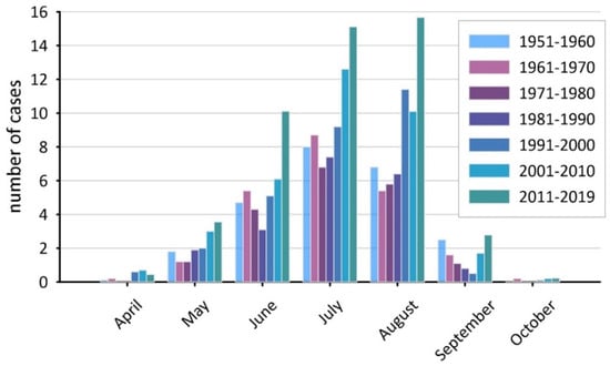 On an annual basis, hot days may appear in Poland from April to October. In the first part of the analyzed period, they most often appeared in July, and slightly less frequently in August. In the past three decades, the proportions have reversed and more hot days were observed in August (Figure 7). The total number of hot days has also increased significantly, confirming a strong upward trend.