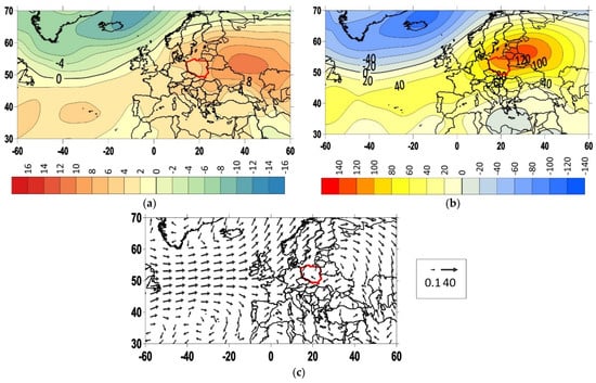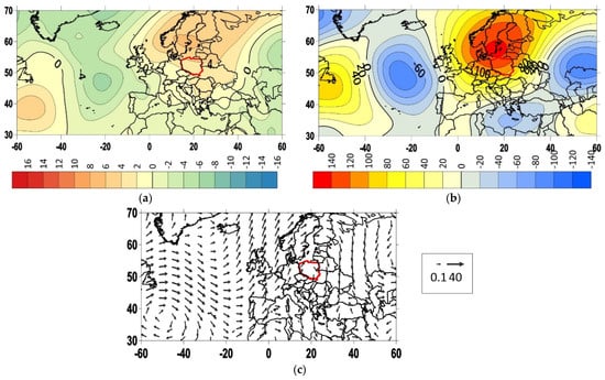 Average fields for the 1963 heat wave: (a) anomalies of SLP; (b) anomalies of HGT700 mb; (c) wind at 700 hPa level. The red line marks the borders of Poland.