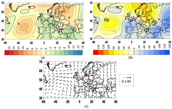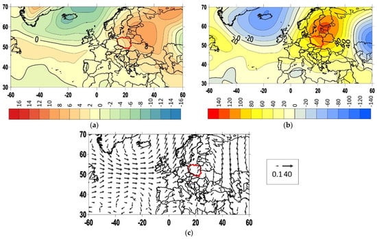Average fields for the 1994 heat wave: (a) anomalies of SLP; (b) anomalies of HGT700 mb; (c) wind at 700 hPa level. The red line marks the borders of Poland.