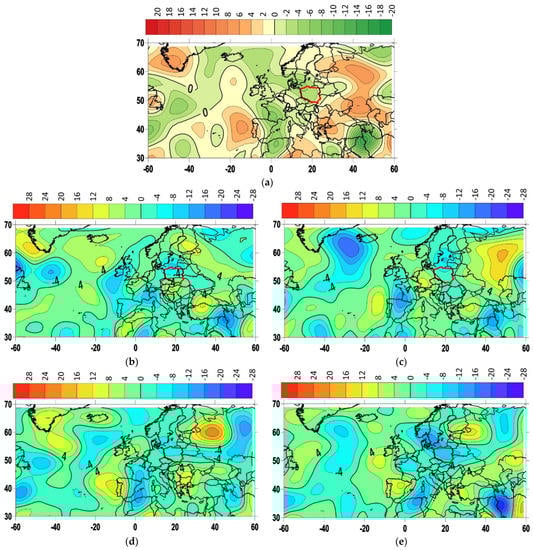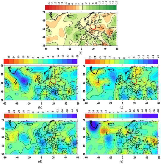 Average vertical velocity anomaly values were positive in Scandinavia, Central Europe, and western Russia, with the highest values in the northern part of the Baltic Sea and in the south and southeast of Poland (Figure 15a). A similar pattern was observed just before and in the first part of the heat wave (Figure 15b,c). It was followed by the stabilization phase, when the vertical velocity anomalies in this region were close to zero. Then the anomalies became negative, an upward motion appeared, the anticyclone weakened, and with it the heat wave ended (Figure 15d,e).