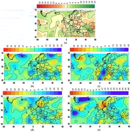 Average vertical velocity anomaly values were positive over almost all Europe, and in the narrow belt over Atlantic a little south of the 50° N parallel (Figure 14a). Before and during the first days of the wave, unlike in the previous cases, the subsidence zone (the area of positive omega anomaly values) was located east of the center of the high-pressure system and not directly in the area of its deposition (Figure 14b,c). Positive values were observed here in the second part of the heat wave duration. On a day after the heat wave, the anomalies became negative, an upward motion appeared, the anticyclone disappeared, and with it the heat wave ended (Figure 14d,e).