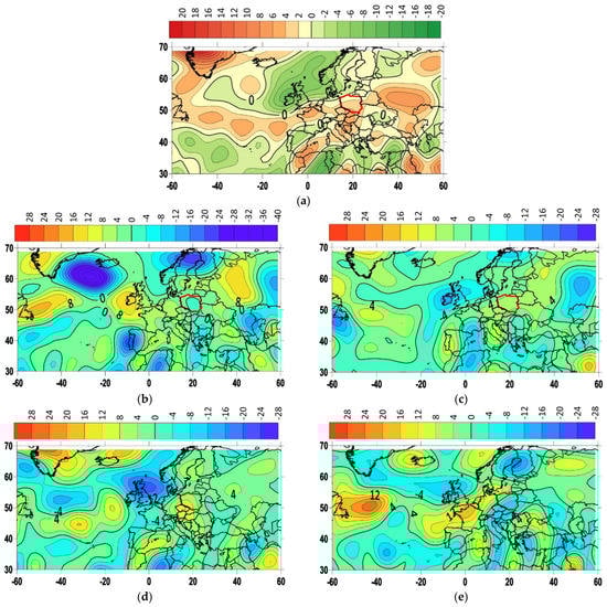 Vertical velocity in 10−2 Pa·s−1 for 1963 heat wave: (a) average in the period 1–7.08; (b) on day before heat wave (31.07); (c) on 2.08; (d) on 6.08; (e) on day after heat wave (8.08). The red line marks the borders of Poland.