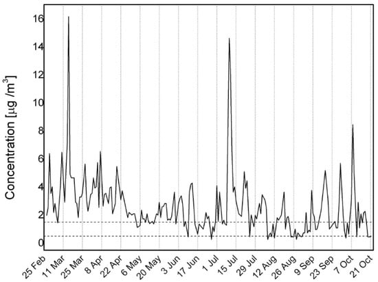 A total number of 196 PM10 aerosol samples were collected from 27 February to 21 October 2015, which is the annual opening period of the station that year. The time series of PM10 concentration is reported in Figure 1. PM10 values show a rather regular trend during the year characterized by a number of narrow concentration peaks on a slightly wavy background. Three main peak events were registered in spring (15 March: 16.2 μg/m3), summer (10–11 July: 14.6 and 12.3 μg/m3) and fall (8 October: 8.46 μg/m3), with baseline values fixed at 1.5 μg/m3 in winter to early summer to 0.5 μg/m3 in the following period. The average of PM10 values in the whole period of sample collection is 2.60 μg/m3 (Table 1).