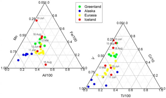 Based on the PSCF analysis, four different high- to mid-latitude dust source regions located in Eurasia, Iceland, Greenland, and Alaska were identified. The patterns of the geochemical markers for Eurasia, Greenland, and Alaska are quite distinguishable from each other while the samples from Iceland are dispersed over a wide range of values which includes those of Eurasia and Greenland (Figure 3). From the spider diagrams of Figure 4 it also appears that aerosols from Greenland and, secondarily, from Eurasia have much similar patterns and are significantly enriched in Cr in respect to those from Iceland and Alaska, consistently with their much regular BT patterns (Figure 2). A significant enrichment in V in respect to Ti is also observed in a couple of samples from Alaska, well in accordance with a derivation from magnetite-bearing ores outcropping in this region (https://thediggings.com/commodities/vanadium/usa/alaska, accessed on 8 January 2021). The patterns of Iceland are more variable. Assuming the patterns of 11 June and 13 June as the main trend (see Section 3.3.1), we see a strong enrichment of Fe, V and Cr in the sample of June 10, a general depletion of all elements but Al and/or Cr in the samples of 15 and 18 August, and a small Ti depletion in the sample of 12 March. Compared to volcanic sands of Iceland [], our 11 and 13 June samples are significantly depleted in Ti and V, and slightly enriched in Cr, as well as being diluted of all the elements.