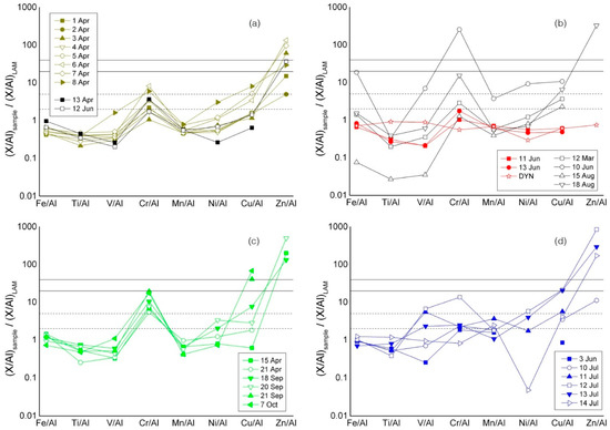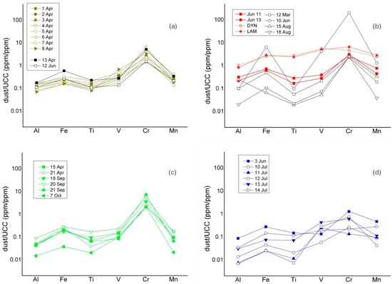 Metal concentrations in the daily aerosol samples from Eurasia (a), Iceland (b), Greenland (c), and Alaska (d). Data are normalized to average upper continental crust (UCC) composition (data from []).
