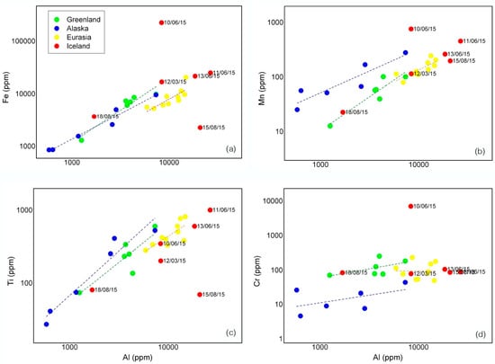 In the Greenland, Alaska, and Eurasia dust sources Fe, Mn, and Ti all show a fairly good correlation with Al while Cr (and V) are only little or partly correlated (Figure 5). The different slopes of the regression lines reflect the presence of a main fraction consisting of aluminium silicate minerals and phases in all the samples, with variable amounts of different iron bearing minerals and metal ores. The samples from Alaska, in particular, are significantly enriched in Mn and depleted in Cr in respect to the rest of the samples suggesting a provenance from carbonate rather than ultramafic rock terranes [,]. Samples related to Icelandic sources are generally much more dispersed though having relatively higher Al contents. This fact points to a more complex composition in respect to the rest of the samples, and it will be focused on in the following sections.