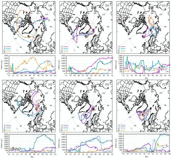 Plots of 240 h back trajectories of 12 March (a), 10 June (b), 11 June (c), 13 June (d), 15 August (e), and 18 August (f), 2015 ending at 0, 6, 12, and 18 UTC upon Ny-Ålesund. The position at 00:00 of each elapsed day is specified by the small number along the paths.