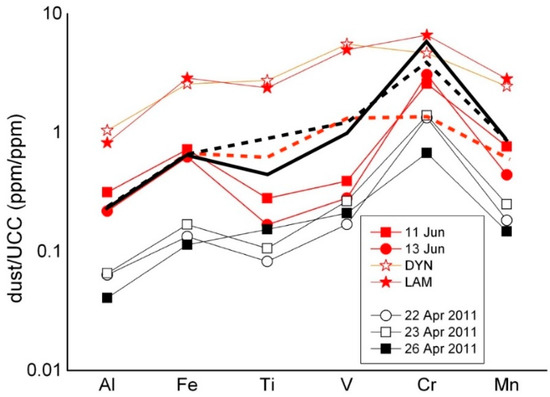 Metal concentrations in the aerosol samples from Iceland (11 and 13 June), compared to Icelandic volcanic sands from Dynjusandur (DYN) and Lambahraun (LAM; after []), and to Icelandic aerosol samples collected in Ny-Ålesund in April 2011 []. The mean trend of DYN and LAM sands (red dashed line), the trend of 26 April 2011 (black dashed line), and the mean trend of 22 and 23 April 2011 (black sold line) have been shifted over the trend of 11 and 13 June in order to be compared.