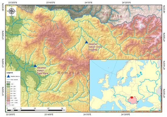 The focus region is small, but it has a complex topography; the selected area extends over two mountain depressions developed on opposite sides of the Țibleș Mountains. Although territorially close to each other, their general climate features are quite different due to their altitude and the barrier generated by the presence of mountains between them. The Meteorological Station of Baia Mare is located in the Baia Mare Depression, on the western side of the mountain chain (Figure 1). This area is characterized by a total annual amount of precipitation of 884 mm/year and by a mean multiannual temperature of 9.6 °C. It is widely open westward and the dominant air masses originate over the North Atlantic Ocean. The Meteorological Station of Ocna Șugatag is located in the Maramureș Depression, East of the Țibleș Mountains (Figure 1). The recorded annual precipitation and mean multiannual temperature are considerably lower than those of Baia Mare (746 mm and 6.8 °C).